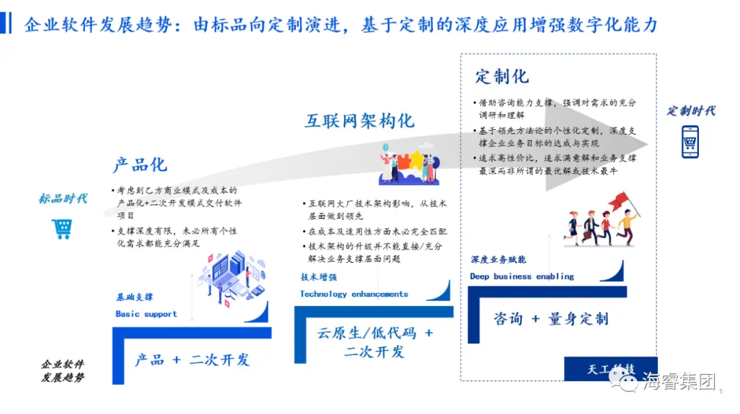 但时至今日我们认为情况已有所不同:首先对于企业来讲经过这么多年信息化/数字化建设,该建的软件基本都建了,几乎不会有太多空白领域没系统,只是支撑得好与不好的问题,既然基础已经有了,相信企业未来的目标不会再是六七十分水平而将追求更高;二是数字化对企业的重要性已今非昔比,更多企业会将此视为核心竞争力而非简单的基础性支撑,不再会是过往的软件基本能用起来就够了,会更专注于软件真正带来业务价值赋能,会更关注软件的用户体验设计;三是软件技术层面已经快速发展了多年,现今完全可做到用更低成本的技术更高效且优质地去完成定制。故海睿数科认为未来的企业软件趋势一定是“咨询 + 量身定制”的模式,充分融合业务咨询能力和技术能力,深度赋能企业业务,实现业务价值增值。