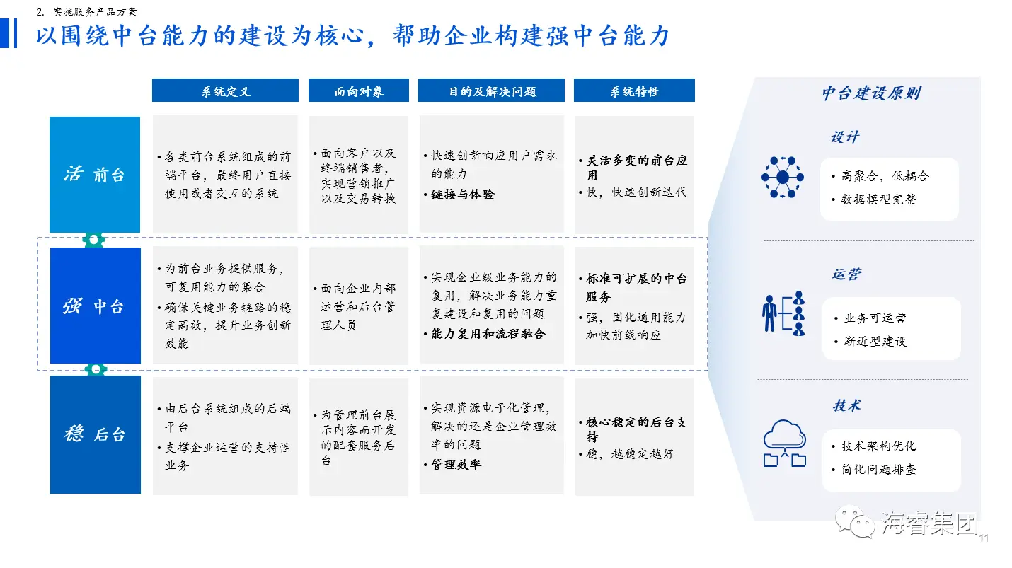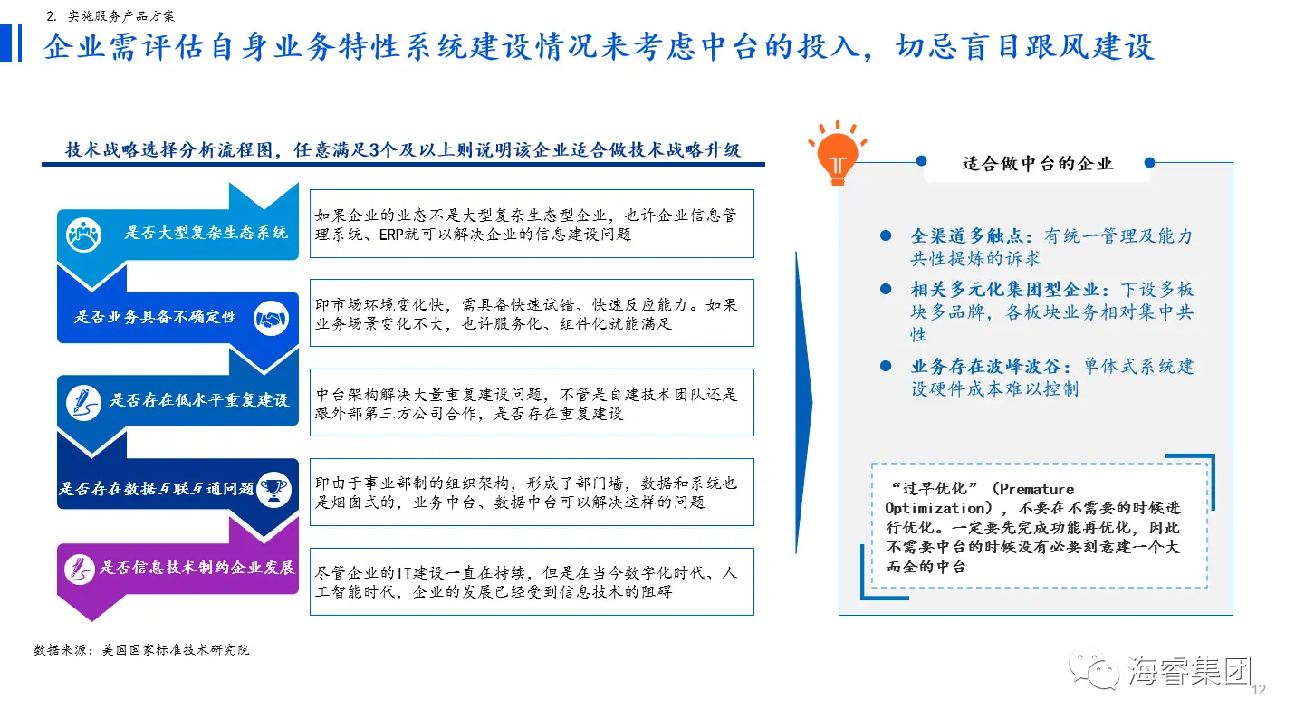 当然现在互联网公司们在这方面已成熟很多,一是因为招了很多咨询公司的顾问,一定程度上弥补了些之前不太熟悉传统企业业务的短板;二是因为经历了更多经验累积更丰富,理解了在ToB行业已经沉淀了几十年的传统咨询公司和软件公司们也并非纯靠忽悠而毫无实力,故迄今很多互联网企业也不再像以前那样仅是鼓吹中台,而是站在更全面、更深入的视角去整体看待传统企业的数字化建设。