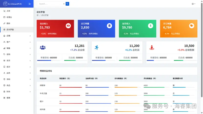 点单功能能快速选择及响应,提升点单效率;收银环节集成多种支付方式,实现快速、安全交易,减少顾客等待时间,消费后自动累计会员积分、记录偏好标签,为精准营销打下基础;(厨房)履约环节,系统与厨房无缝对接,实时传递订单信息,合理安排出餐顺序,确保菜品及时准确送达,减少人工传单错误,提高出餐效率,提升顾客用餐体验;客户管理功能可记录顾客消费习惯、偏好等信息,为精准营销提供依据,通过会员体系、积分兑换等方式增强顾客粘性;系统实时监控库存动态,自动预警低库存商品,避免缺货或积压;进货管理模块与商品库存数据联动;销售模块以订单与退货单精细化管理为核心,订单管理覆盖从创建到完成的全流程,支持堂食、外卖、自提等多场景下单,自动关联商品信息、价格体系及促销规则,下单后实时同步至库存系统扣减数量,确保交易数据与支付金额精准匹配,避免账实不符。退货单功能则通过标准化流程降低纠纷风险:顾客发起退货时,系统自动核验原订单信息、商品状态及退货时效,符合条件后快速生成退货单,同步触发库存回补、款项原路返还操作,为商品优化提供数据参考。针对促销活动(如满减、折扣、赠品),系统可自动计算活动成本,避免人为核算错误,确保利润可控。系统实现“人、货、场” 数智化管控:店员排班、考勤统计一键完成,同时,店员权限分级管理(如收银员、店长、财务)保障数据安全。商品与赠品的入库、出库、盘点清晰明了,支持不同店铺之间跨店调货。场地通过数据看板直观呈现。财务与清晰呈现收支情况,为财务决策提供有力支持。报表功能则提供多维度的数据分析,帮助企业洞察经营状况,及时调整策略。系统详细功能介绍如下: