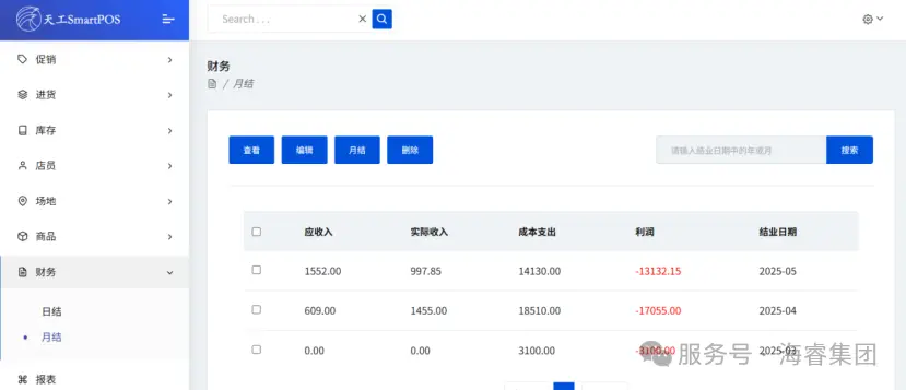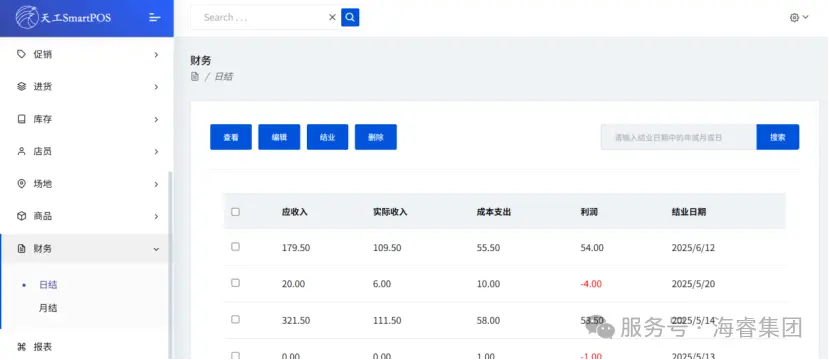天工POS系统日结管理功能实现每日经营数据自动化整合:自动抓取订单中的结业日期、各渠道收入及成本数据,支持手动补录其他支出;用户选定日期后,系统自动计算应收入、实际收入、总成本及利润,生成可视化报表,助力企业实时掌握盈利状况,优化财务决策。